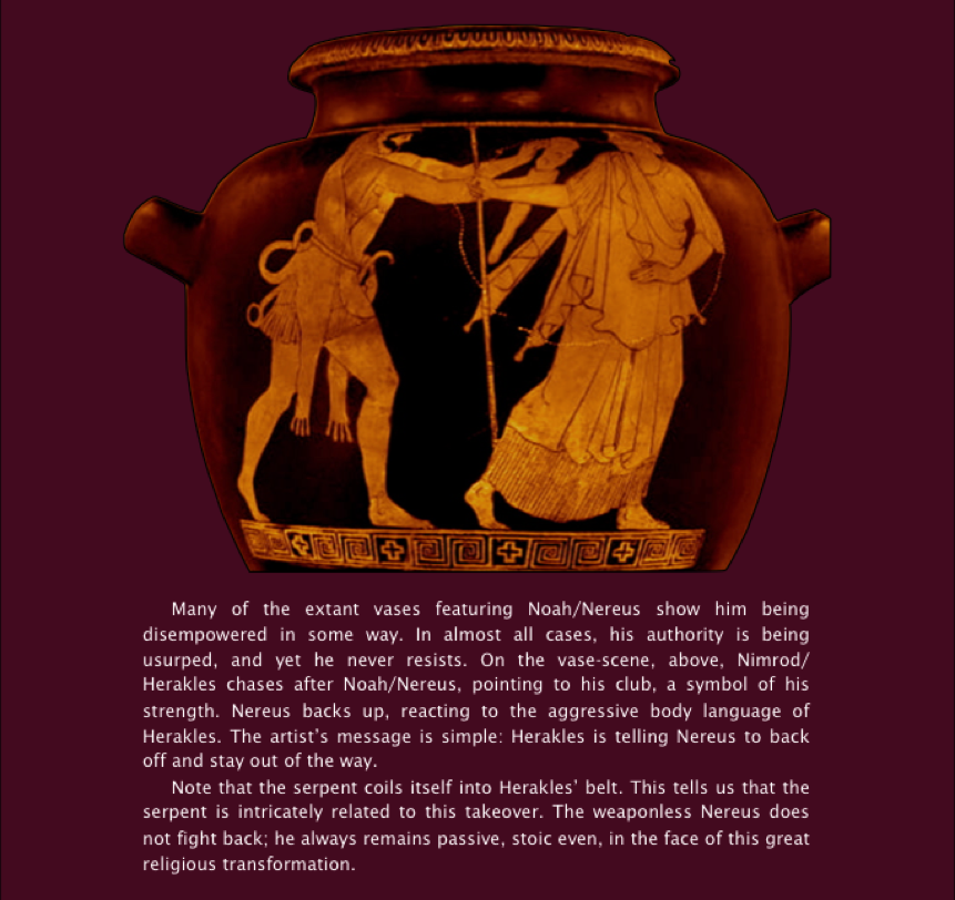 Many of the extant vases featuring Noah/Nereus show him being disempowered in some way. In almost all cases, his authority is being usurped, and yet he never resists. On the vase-scene, Nimrod/Herakles chases after Noah/Nereus, pointing to his club, a symbol of his strength. Nereus backs up, reacting to the aggressive body language of Herakles. The artist's message is simple: Herakles is telling Nereus to back off and stay out of the way.