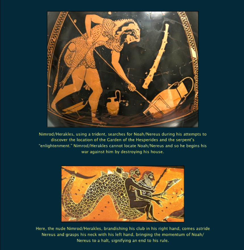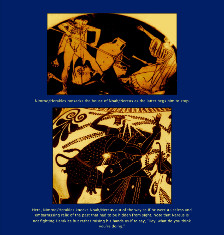 Here, Nimrod/Herakles knocks Noah/Nereus out of the way as if he were a useless and embarrassing relic of the past that had to be hidden from sight. Note that Nereus is not fighting Herakles but rather raising his hands as if to say, “Hey, what do you think you’re doing?”