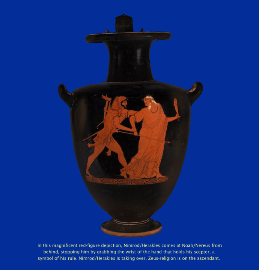 In this magnificent red-figure depiction, Nimrod/Herakles comes at Noah/Nereus from the rear, stopping him by grabbing the wrist that holds his scepter, a symbol of his rule. Nimrod/Herakles is taking over. Zeus-religion is on the ascendant.