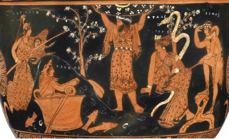 The scene takes place in the Garden of the Hesperides, the Greek version of Eden. An Hesperid (nymph of the West) tends the serpent-entwined apple tree (Genesis doesn’t say what kind of tree it was; it’s from the Greek tradition we get the idea Eve ate an apple).