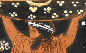 Nimrod/Herakles, wearing his lion’s skin, has paddled his way through the water in the bowl of the sun, suggesting a passage back through time. After Nimrod/Herakles routed the line of Seth on behalf of his grandmother Naamah/Athena in the post-Flood world, Greek sculptors pictured Lamach/Atlas figuratively presenting the fruit of the serpent’s tree to his great-grandson, Nimrod/Herakles, as a sign that the latter had earned the right to rule post-Flood humanity in accord with the way of Cain—the Creator pushed away and mankind exalted.