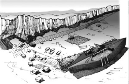 Sketch of the landing site on Mashu or Mesha Mountain as the survivors began to construct the first post-Flood city—Mesha. The ark was used to secure building materials such as wood for roofing and tar for sealing the roofs. Noah’s agricultural patch appears on the plateau. At present, this patch of ground harbors many types of plants that grow here profusely; but outside the perimeter of the small field, almost none of these plants appears. This patch shows up on aerial photos and cannot be easily explained except to say it was at one time a small field—perhaps for the grapes that Noah used to make his wine (Genesis 9:20).